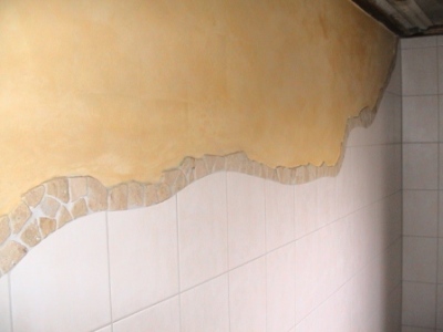 Badezimmer mit hochwertigen Wandfliesen, dekorative Bruchkante aus Natursteinmosaik; Wandgestaltung in Spachteltechnik